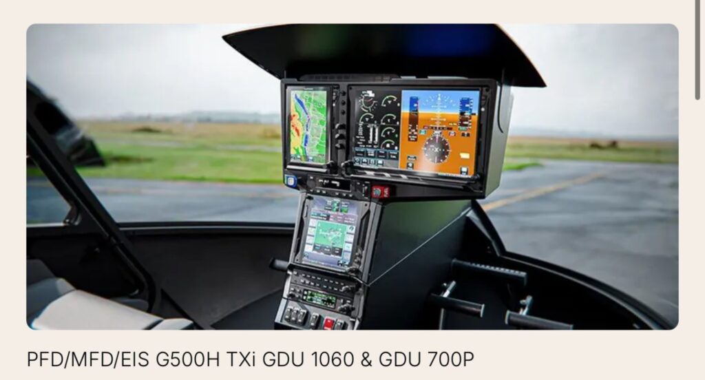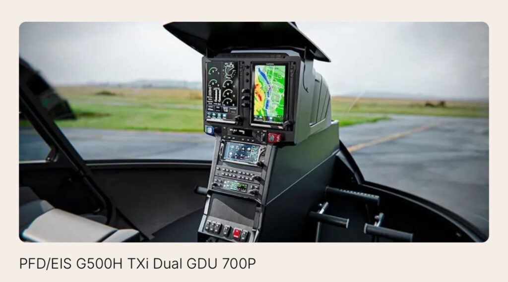 • Garmin G500H 700P/700P TXi or an optional 1060/700P TXI flight display as well as Garmin GTN 750Xi GPS/COM/NAV.